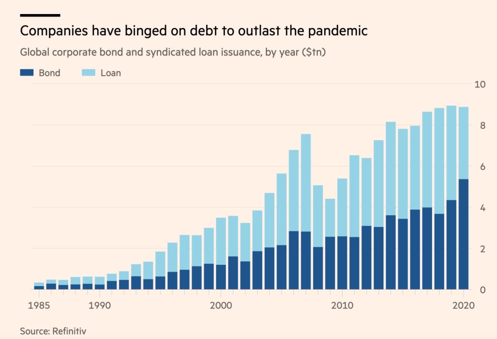 This debt build-up has been mirrored in companies, where corporate treasurers have been quick to load up on what in the past few years has been exceptionally cheap debt through the corporate bond market. Companies went on a borrowing binge in 2020, as they faced into sharp declines in business activity Global corporate debt issuance surged to $5.4tn, a record high and over 20% more than the previous year. Companies also tapped the syndicated loan market for a further $3.5tn. Coupled with the downturn in profitability for much of the corporate world, the borrowing spree has driven up leverage ratios to all-time highs. The ratings agencies view balance sheets as increasingly unstable and forecast a rise in corporate defaults and in the number of “Zombie” companies, where interest payments exceed profits.